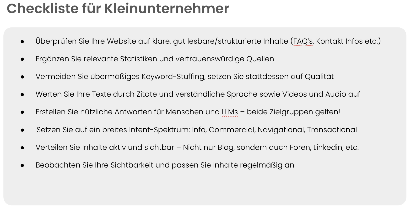 - Diese Kennzeichnung erleichtert es KI-Systemen, relevante Informationen schnell zu extrahieren und in Antworten zu integrieren. - Klar strukturierte Inhalte: